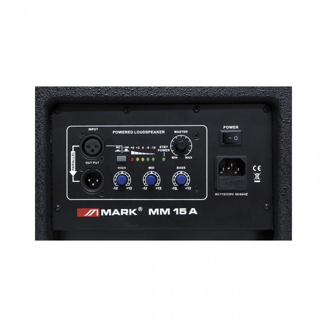 Monitor autoamplificado Mark para escenario. El MM 15 A es un monitor de suelo amplificado de 400W con altavoz de 15" y motor de compresión coaxial de 1,34". Está hecho de madera de alta densidad y cuenta con entrada y salida de audio con conector XLR3, selector de entrada y control de volumen y tonos