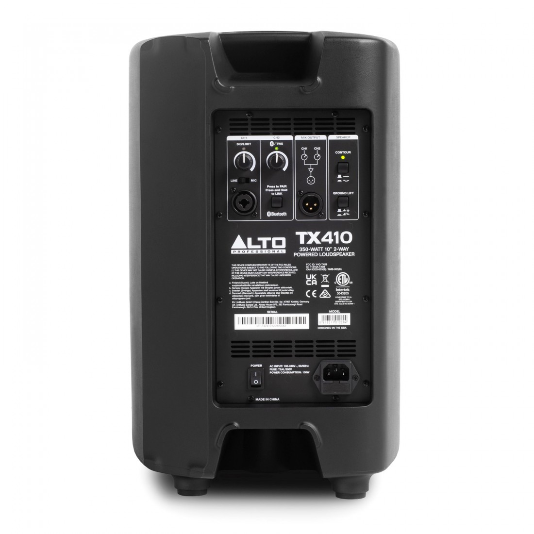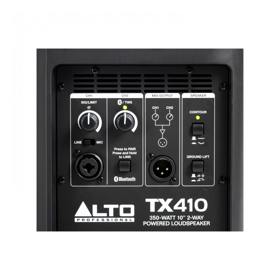 TX410 pertenece a la renovada generación 4 de la serie TX de Alto Professional, una serie que se presenta con conectividad Bluetooth y que destaca por su enfoque en la precisión y el detalle, sin sacrificar la fuerza sonora. Diseñado y ajustado en Estados Unidos, el altavoz activo Alto Professional TX410 equipa amplificadores Clase D ultraeficientes de 350W (250W LF + 100W HF), woofer de 10" con bobina móvil de 1,4" y motor de agudos con diafragma de titanio de 1", lo que lo convierte en el aliado perfecto para cualquier tipo de evento, independientemente de si es al aire libre o en un espacio cerrado. De fácil configuración y optimizado para ofrecer una respuesta de frecuencia excepcional, garantizando que cada nota y cada beat se escuchen con claridad, el altavoz autoamplificado TX410 de Alto Professional es una apuesta segura para músicos, DJs y artistas de todos los géneros.