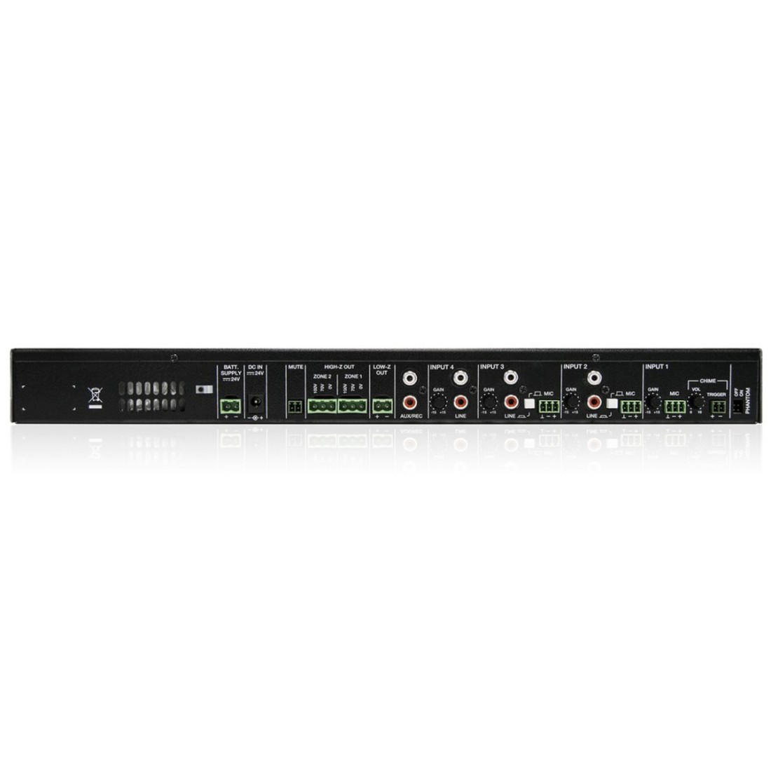 - Botones de control: 1x Talkover, 1x Auto-standby, 1x Phantom ON/OFF, 1x CHIME TRIGGER, 1x ZONE ON/OFF.