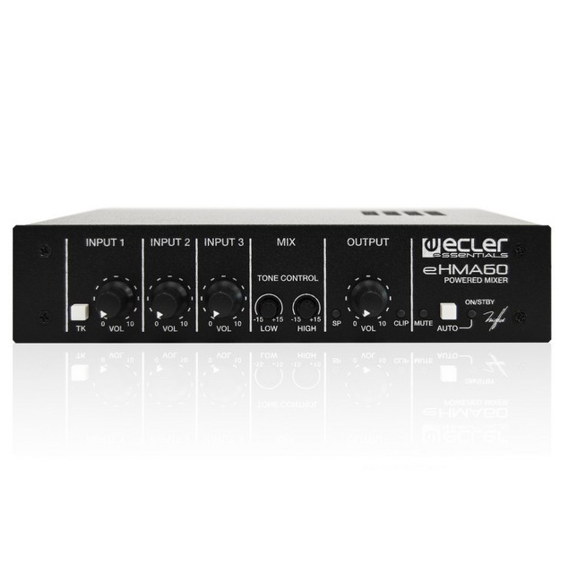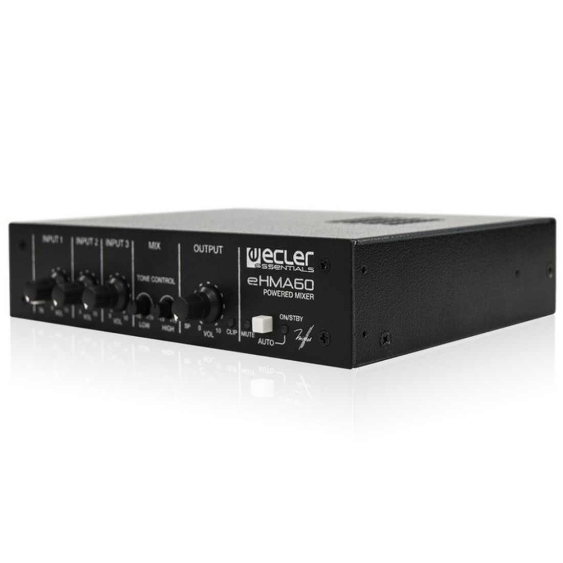 El Ecler eHMA60 es un mezclador-amplificador compacto y versátil que ofrece una solución completa para instalaciones comerciales y públicas. Cuenta con una entrada MIC (de micrófono) y dos entradas MIC/LINE estéreo. Con una potencia de salida de 60W, está preparado para líneas de altavoces tanto de baja impedancia (4 ohmios) como de alta impedancia (70V, 100V). También incluye un sistema de prioridad de audio (avisos de megafonía, emergencias, etc.), control de tonos de 2 bandas, modo auto stand-by, puerto MUTE y fuente de alimentación externa universal.