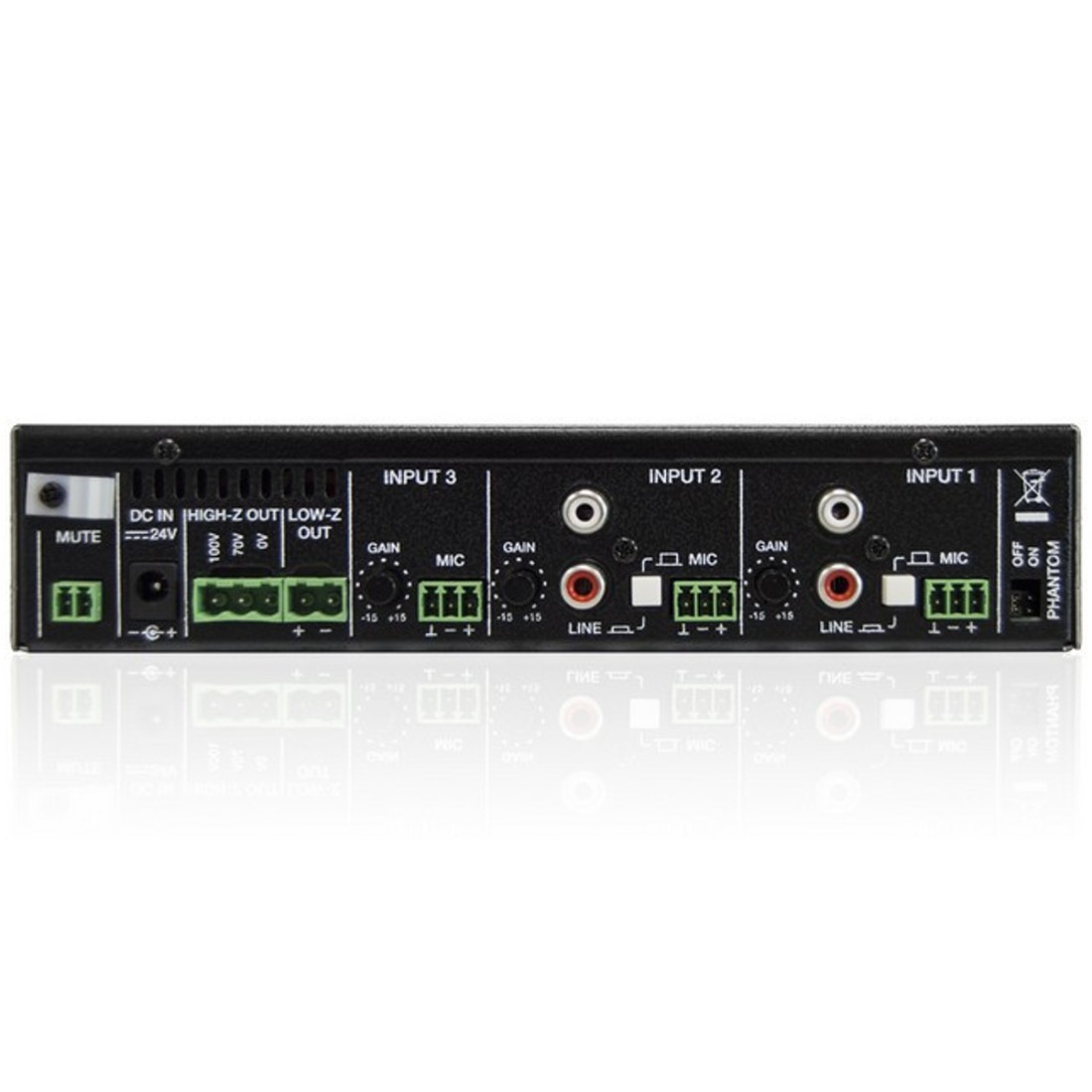 - Ajustes de salida: Salidas Lo-Z/70V/100V.