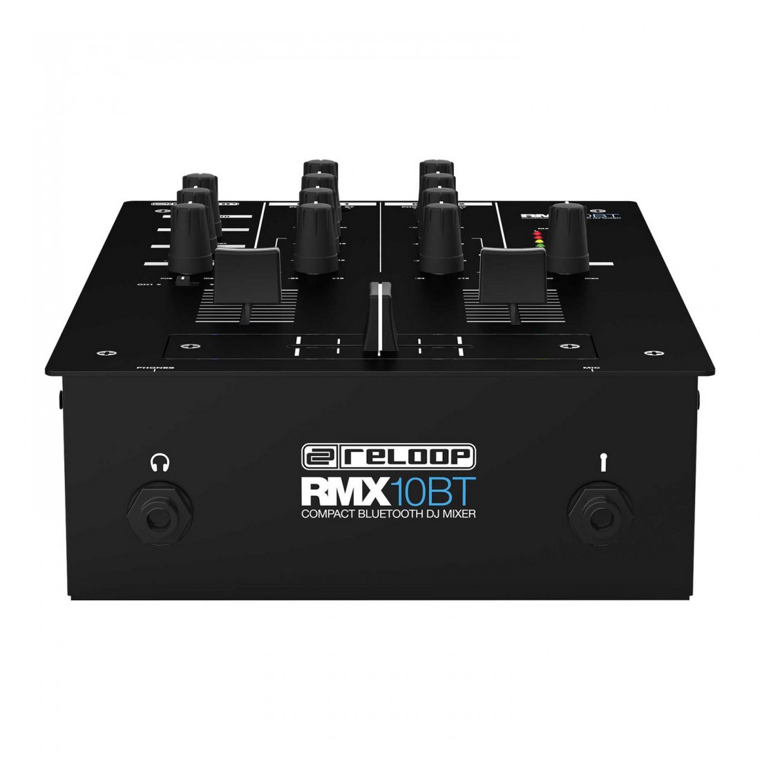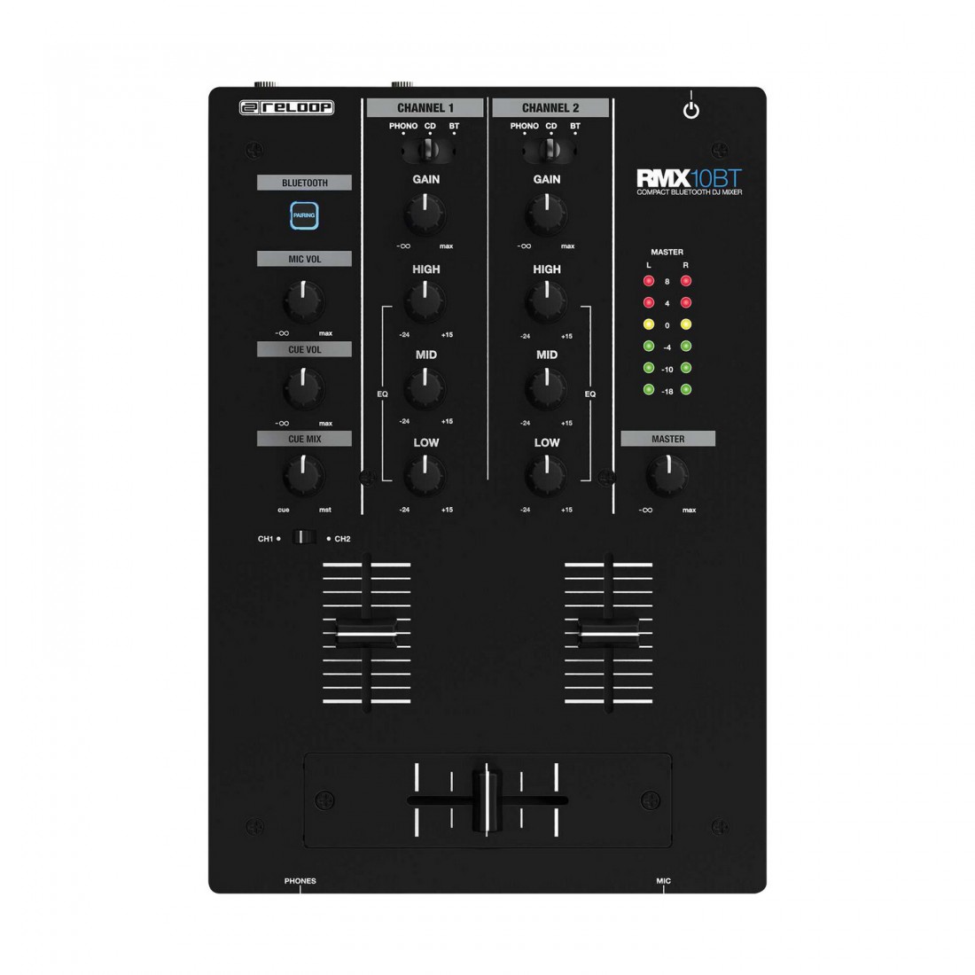 Reloop RMX-10 BT es un mezclador de 2 canales para DJ, que se presenta en un formato compacto y que integra una interfaz Bluetooth para la transmisión inalámbrica de música desde cualquier dispositivo con Bluetooth, ofreciendo la posibilidad de utilizar un teléfono inteligente o una tableta como fuente de reproducción. La señal Bluetooth se puede enrutar a ambos canales del RMX-10 BT. Además, el crossfader de 45mm es reemplazable por el usuario y los faders de línea de canal son muy suaves y hacen que la mezcla sea más cómoda. Cada canal tiene una ganancia individual control y ecualizador de 3 bandas. El RMX-10 BT tiene una entrada de micrófono de jack de 1/4 con ajuste de volumen por separado y salida de jack para auriculares con ajuste de volumen y función cue-mix. El volumen de salida maestro puede ser monitoreado a través de una pantalla LED integrada. La construcción es muy robusta y compacta totalmente en metal.