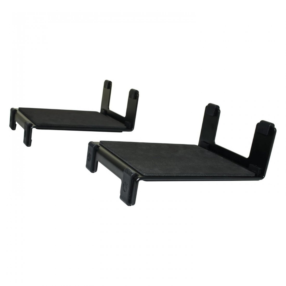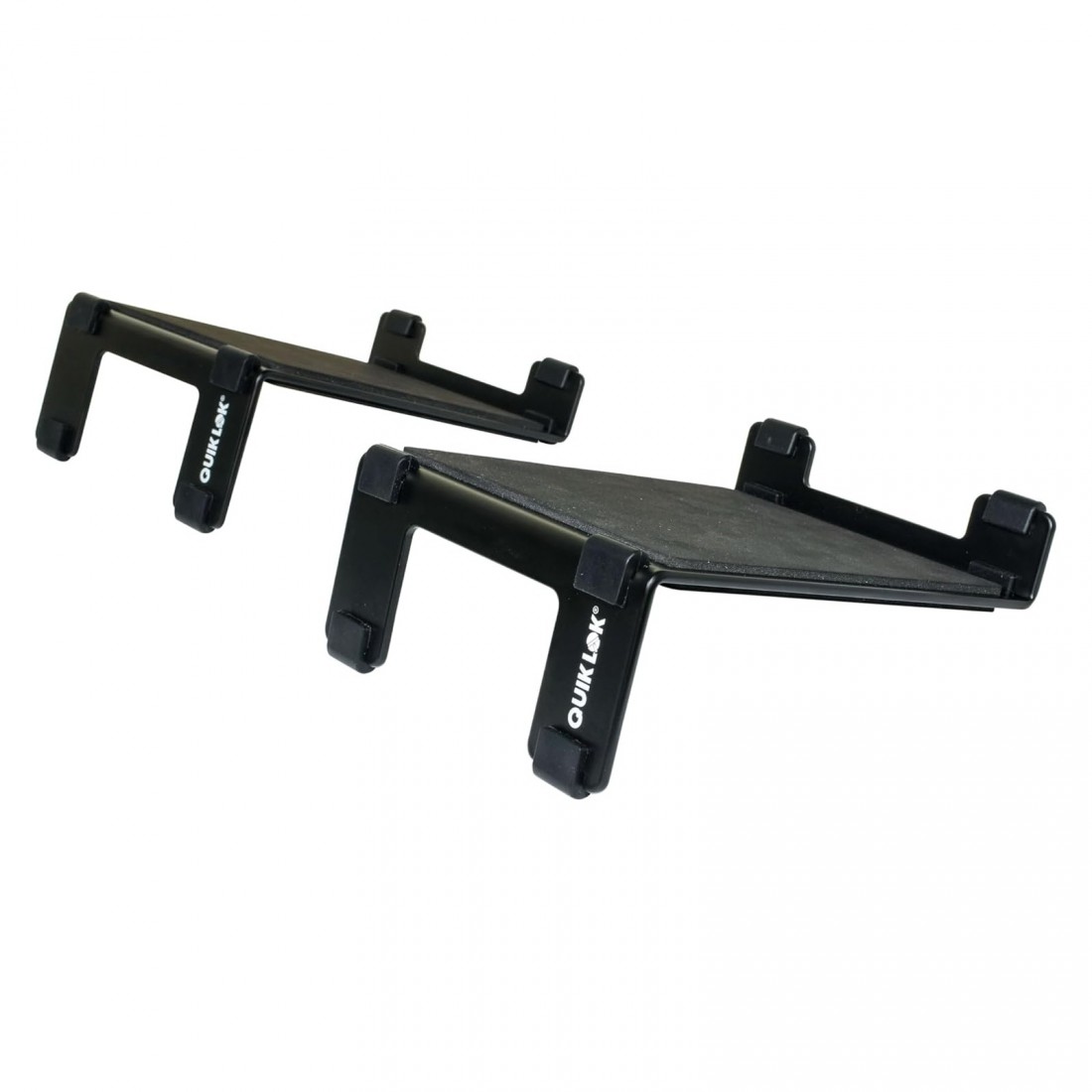 Soportes de altavoz Quik Lok para escritorio ideales para mejorar la escucha en estaciones de trabajo multimedia. El diseño inclinado permite orientar los monitores directamente hacia el oyente, reduciendo reflexiones y mejorando la claridad del sonido. Incluyen doble sistema de aislamiento con goma antideslizante y espuma adhesiva para eliminar vibraciones no deseadas. Fabricados en acero, ofrecen dos ángulos de inclinación (10° y 20°), adaptándose a monitores de distintos tamaños. Con un acabado negro elegante, son perfectos para estudios caseros, oficinas y creadores de contenido.