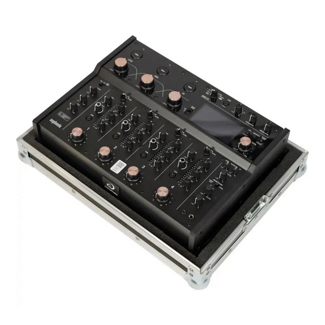 Maleta DJ profesional Walkasse para mezclador Alphatheta EUPHONIA. Diseñada y fabricada en España, esta maleta cuenta con estructura de madera contrachapada WBP de abedul finlandés de 7 mm y perfiles de aluminio robustos. Su interior está acolchado con espuma técnica de varios grosores y acabado en espuma EVA, lo que garantiza una excelente protección del equipo durante el transporte. Incluye compartimento específico para cables y accesorios, hueco empotrado para el mezclador y es compatible con cubiertas Decksaver.