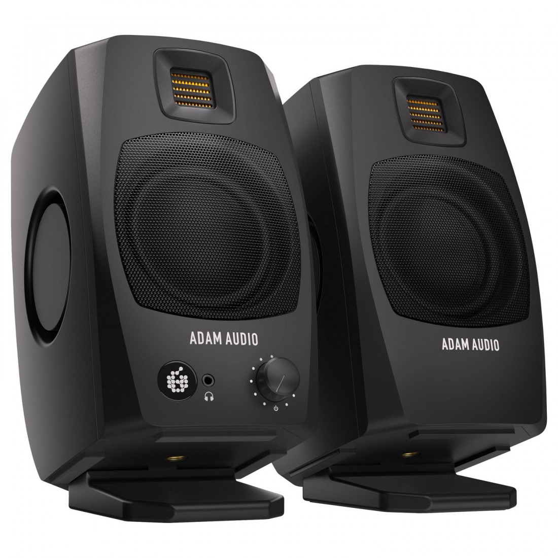 Monitores de escritorio activos Adam Audio en color negro. El sistema D3V ofrece una solución compacta y potente para creadores exigentes, con conectividad USB-C directa, woofers de aluminio, tweeters de cinta D-ART y radiadores pasivos que garantizan un sonido preciso y equilibrado en cualquier entorno.
