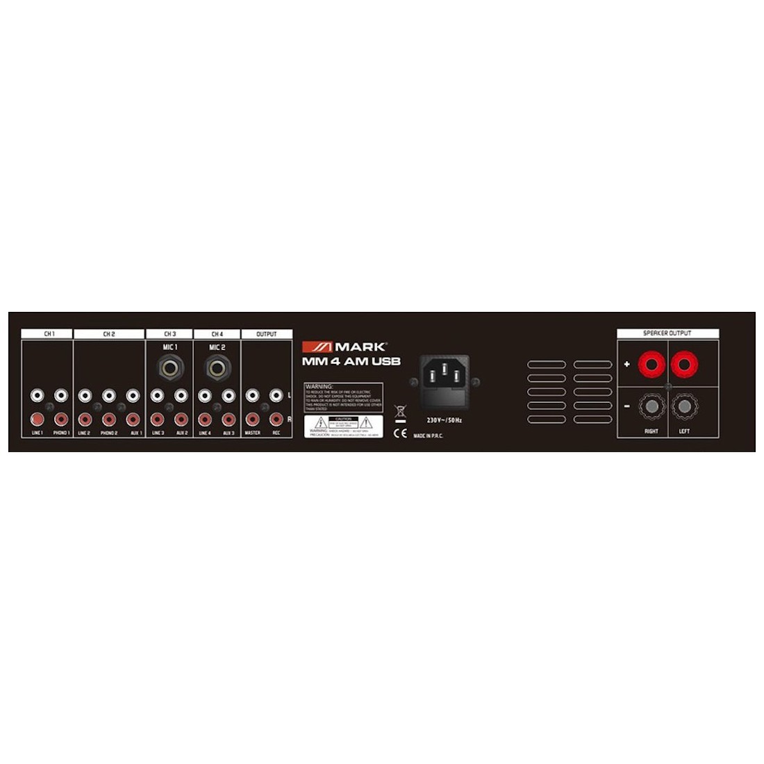 Mezclador amplificado Mark de 4 canales formato rack con reproductor USB/SD/Bluetooth. MM 4 AM USB es un mezclador analógico de Mark que cuenta con un amplificador de potencia de 2x250W a 4 Ohm, garantizando un sonido potente y de alta calidad