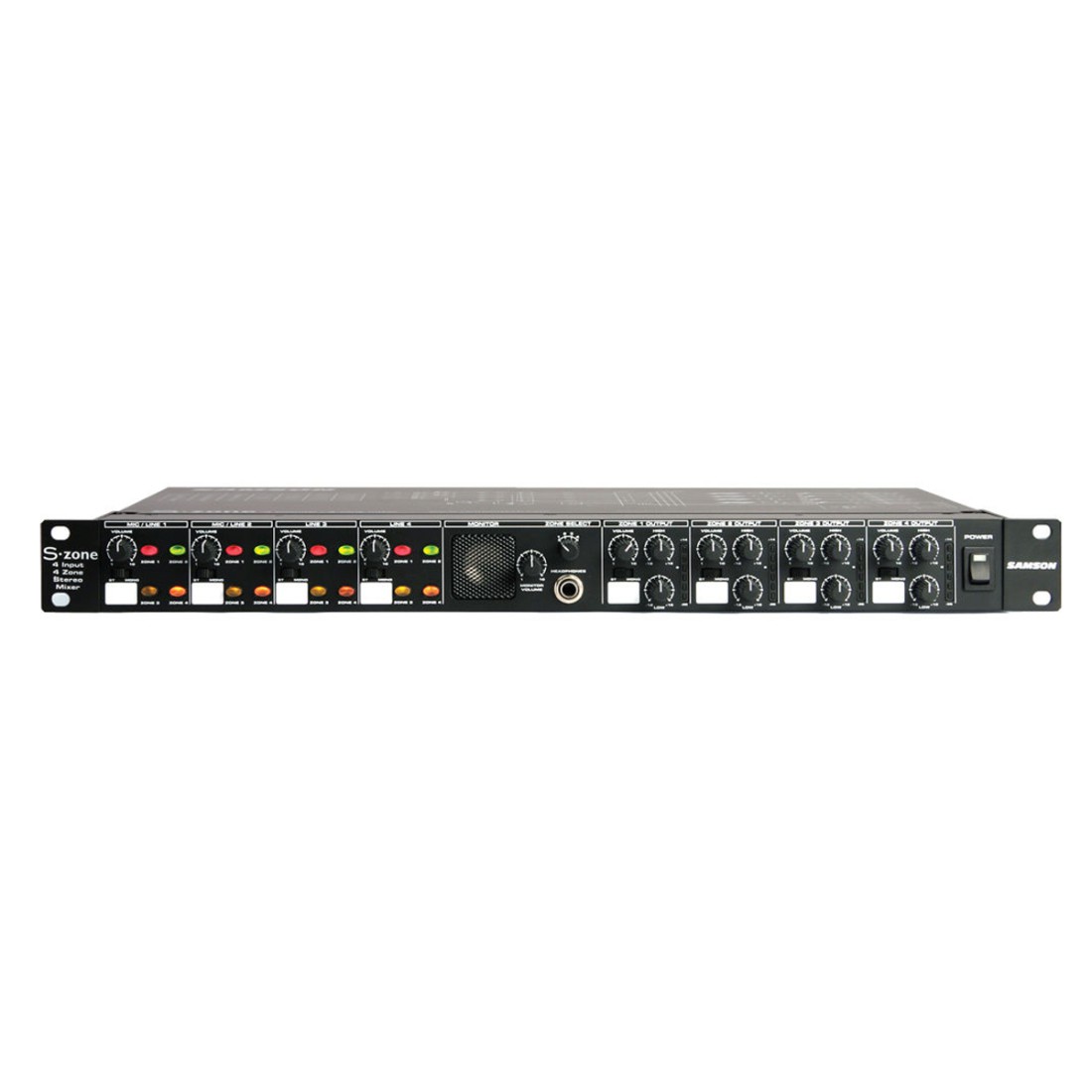 Mezclador instalación de 4 entradas y 4 zonas estéreo. El Samson S-Zone es un mezclador de 4 canales en formato rack 1U que permite controlar hasta cuatro zonas de audio estéreo. El S-Zone de Samson cuenta con 2 entradas de micrófono balanceadas y 4 entradas auxiliares/linea estéreo, además de 4 salidas estéreo de zona con control de volumen independiente por zona