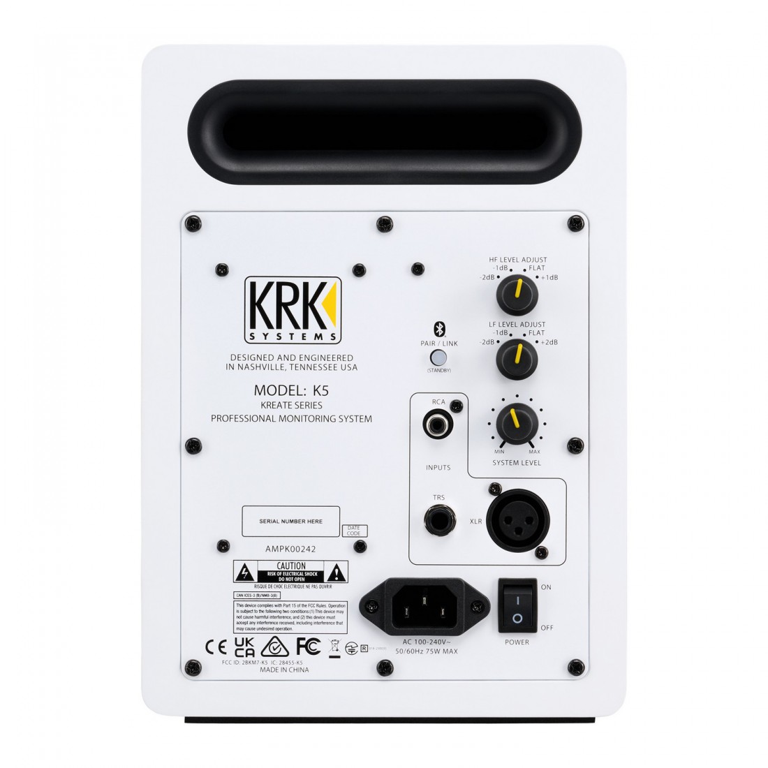 Monitor activo KRK de campo cercano con Bluetooth. KRK Kreate 5 White es un monitor de estudio equipado con biamplificador de 60W, woofer de 5", tweeter de 1”, conectividad Bluetooth, controles de ecualización y diferentes opciones de entrada, lo que lo convierte en una solución práctica y versátil para estudios de grabación caseros y entornos multimedia